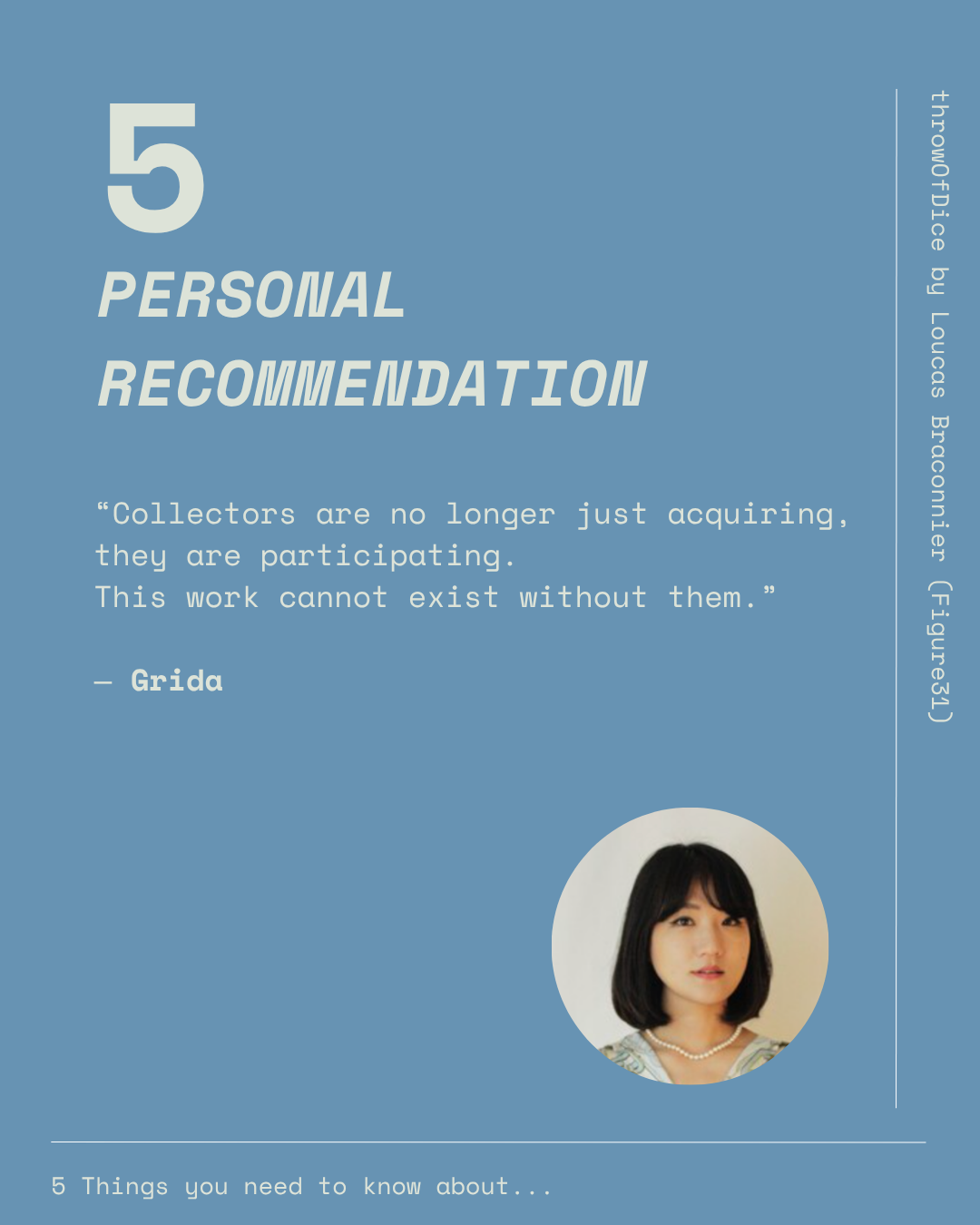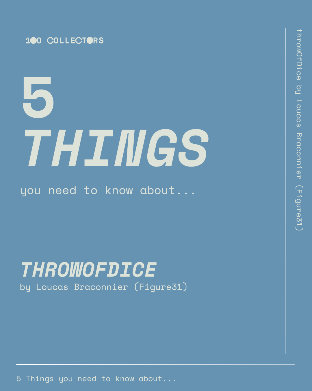 throwOfDice is a fully on-chain blockchain art project by Loucas Braconnier aka Figure31, curated by Grida. It takes the ancient form of dice and rethinks it through smart contract logic, turning chance, choice, and relation into the core material of the work. Rather than treating the image as the main event, the project positions the system itself as the artwork.