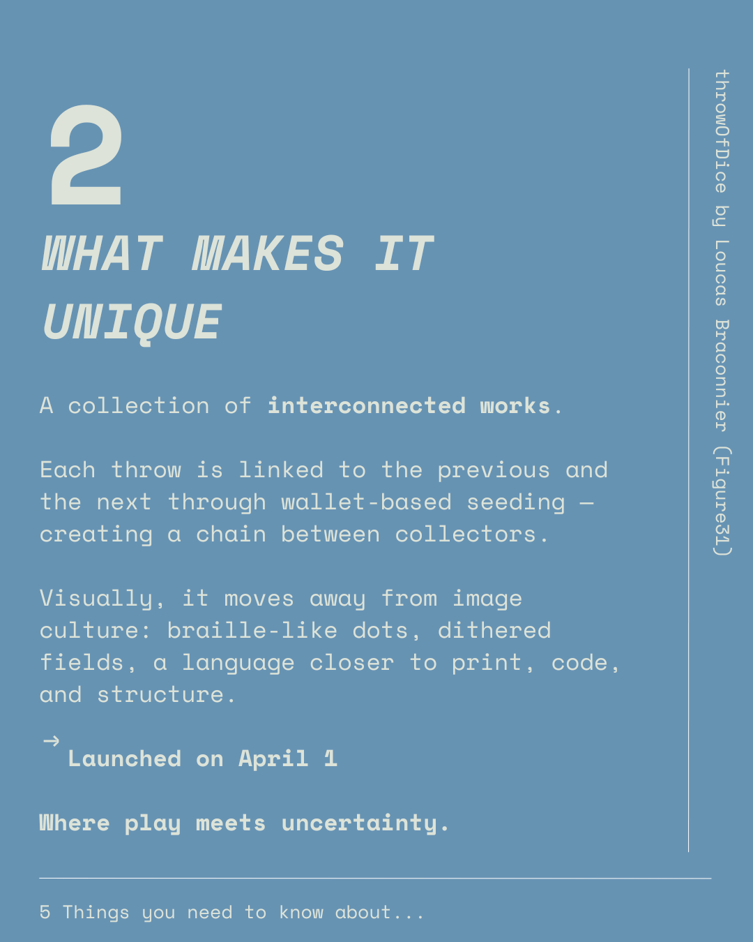 Visually, throwOfDice uses a tactile language inspired by Braille and dithered dot fields, closer to printmaking, code, and conceptual structure than to a conventional image drop.