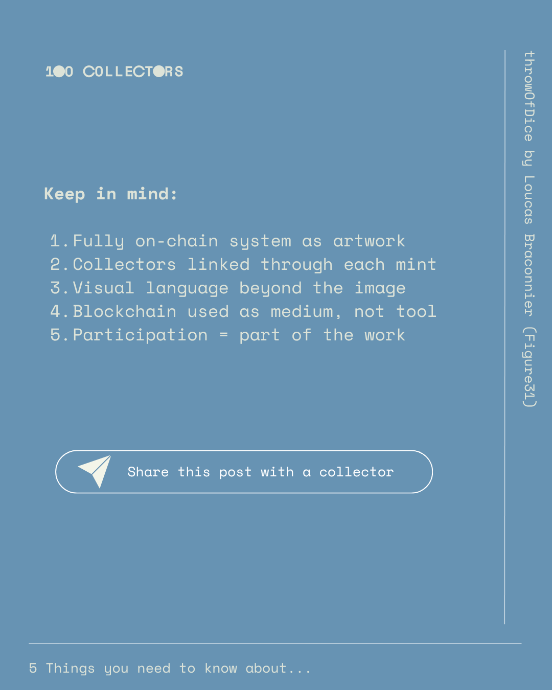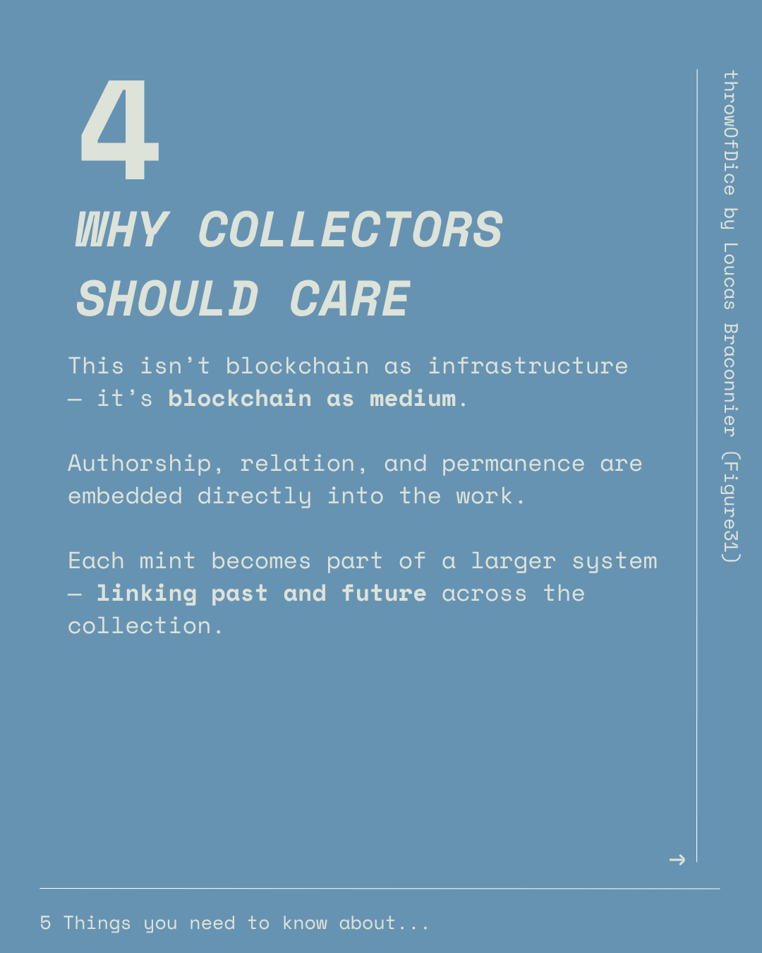 This approach is deeply consistent with Loucas Braconnier’s practice, which has long explored system-based logic, persistence, and interaction in on-chain art. For him, blockchain is not simply a place to host images, but a universe where art can sustain its own rules and duration. throwOfDice brings these concerns into sharp focus: the image is both a fixed result and a living process, where one choice becomes part of a larger structure linking past and future across the collection.