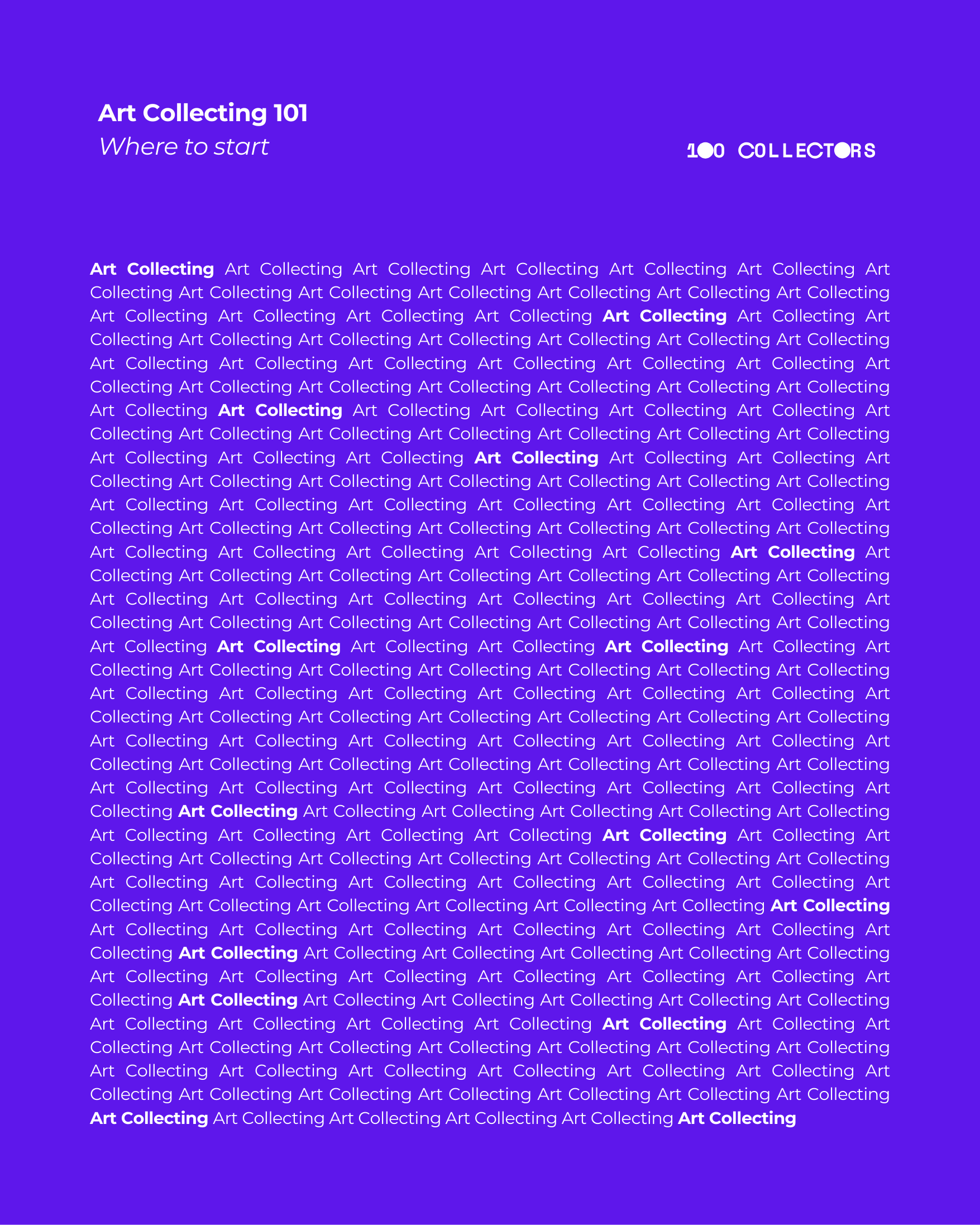 Whether you are buying your first artwork or looking to structure a growing collection, this guide outlines the essential foundations of art collecting today, across contemporary and digital art. It brings together practical advice, real-world experience, and a clear methodology developed by 100 collectors to help you approach collecting with confidence.