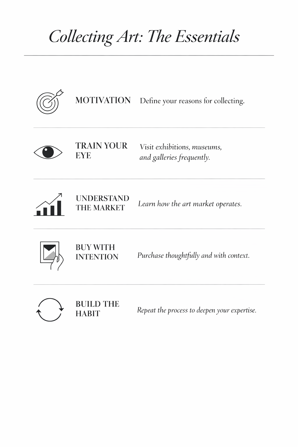 Learn how artworks circulate, how prices are formed, and how galleries and platforms operate. - ACTION: Move from interest to action intentionally