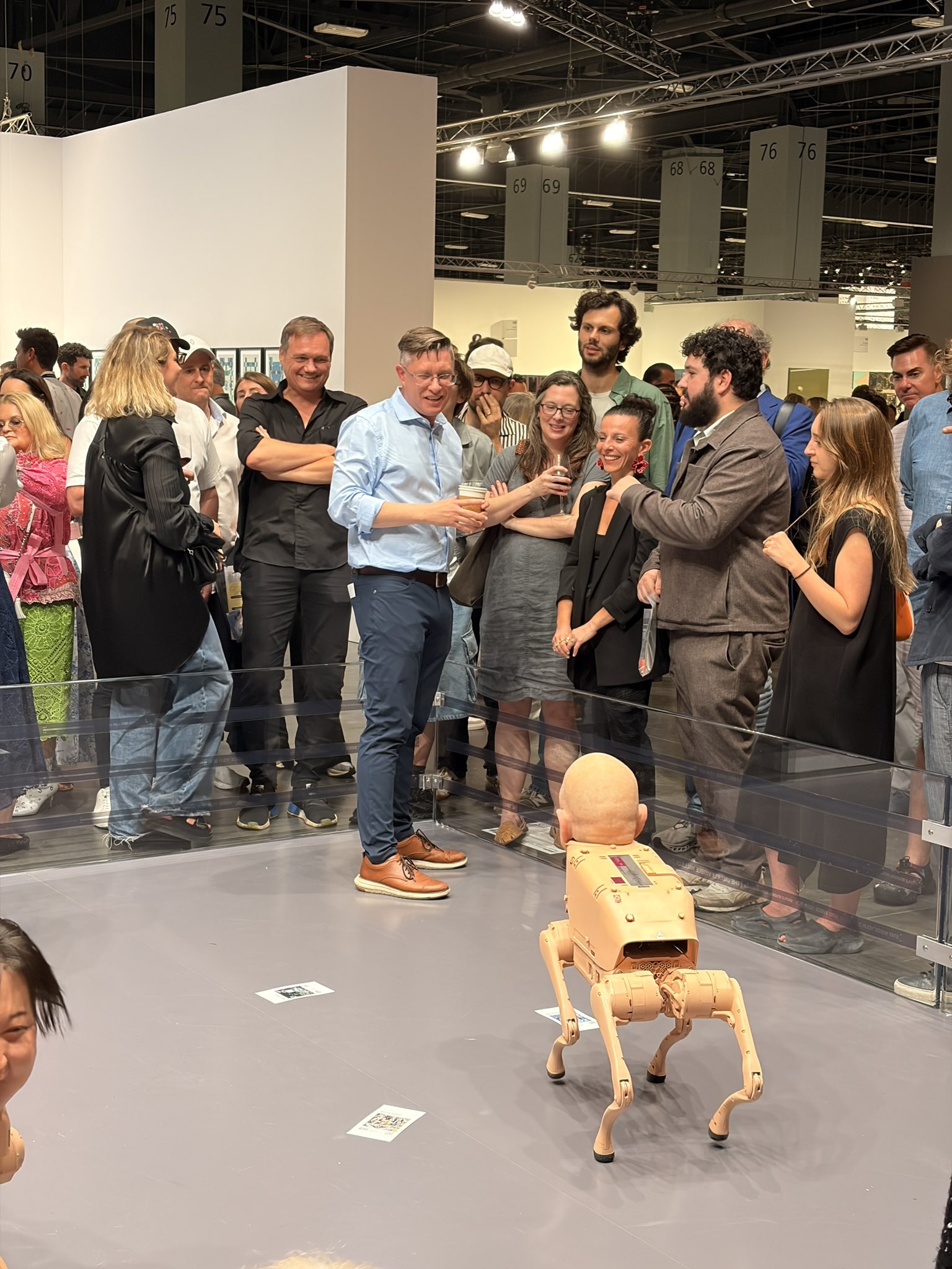 But nothing compared to Beeple’s Regular Animals, which quickly became the phenomenon of Art Basel Miami Beach. The installation featured animatronic robot dogs wearing hyper-realistic silicone masks of Elon Musk, Jeff Bezos, Mark Zuckerberg, Picasso, Warhol, and even Beeple himself. These robotic “animals” wandered inside a fenced pen, photographing visitors with cameras embedded in their heads, processing the images through AI filters tied to each persona, and then excreting the resulting prints as satirical artworks. The prints - and sometimes NFTs - were free, but could only be obtained by physically standing there and waiting for a dog to “poo.” The crowds were enormous. By day two, it felt like a pilgrimage site. The installation appeared in newspapers, magazines, national TV, international TV: everyone came to see the dogs. Unlike certain infamous fair controversies (yes, the banana), nothing had to be removed. Despite the chaos, the atmosphere remained fun, communal, and strangely harmonious. I believe this is because the digital art community is fundamentally more open and welcoming than the traditional art world. People didn’t feel policed or out of place; they felt invited. Underneath the absurd spectacle lay a sharp critique of control, power, identity, and the absurd mechanics of value in today’s algorithmic society. Beeple did what he always does: provoke, disrupt, entertain, and trigger real reflection.